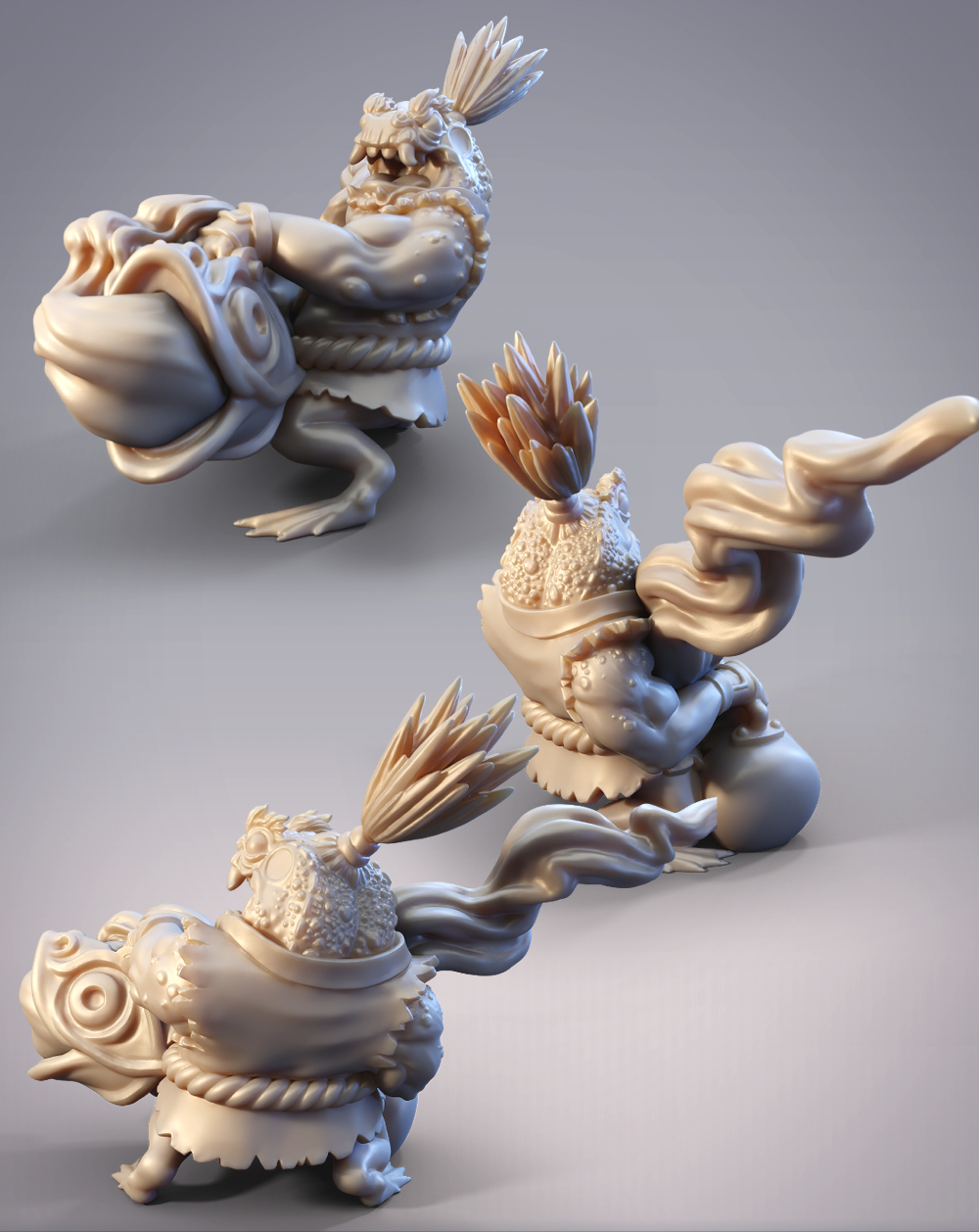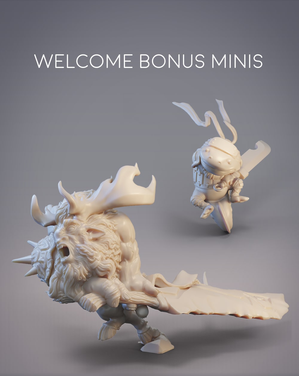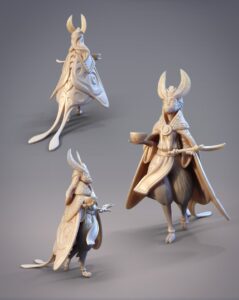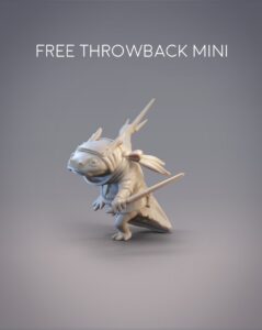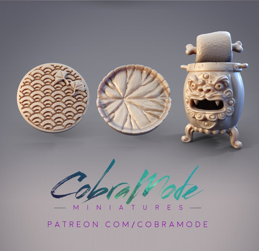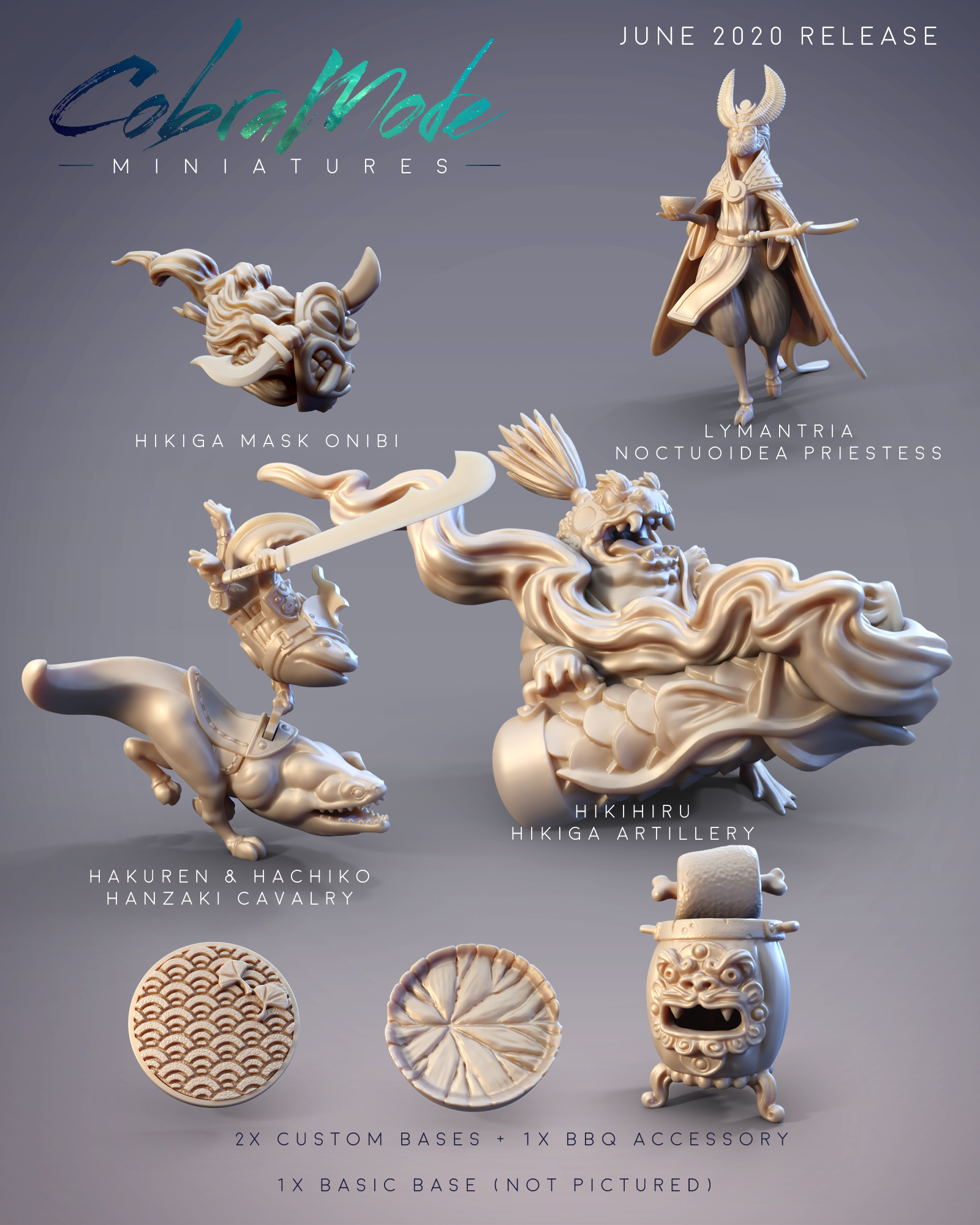 For June, we have 4 minis, 2 bases, and 1 bbq accessory for Hikihiru, who loves her bbq meat. We also have our Throwback Mini that was chosen by poll last month. Hatsuharu the Hanzaki Swordbreaker narrowly won against Hanabi the Hanzaki Firebreather by only one vote! And lastly, we reached our 150 patron goal last month so there are now 2 minis in the Welcome Bonus – Arkhan the Ariche Berserker, and Hattori the Hanzaki Ninja Swordsman.