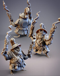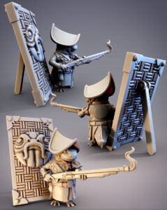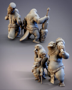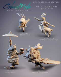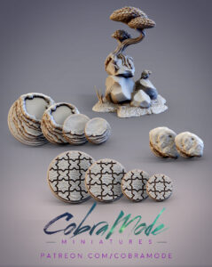 This month we’ve been madly sorting, organizing, and giving away our stuff in preparation for moving. Official moving day is Nov 3, so wish us luck 😀 It’s been pretty hectic, but I feel like this month’s lineup is as adorable as ever. I especially love the platy-peeps, and can’t wait to see them painted up! Norinaga also won the Throwback Mini poll by a landslide, which is very exciting. We also have more base options this month, with 4 sizes each of a Jebel Irhoud tile base and hot spring base, and 2 sizes of a smooth rock base. The bonsai tree terrain piece was inspired by Artbadger’s awesome Asian themed bases that he’s been sharing on Discord. If you haven’t joined the channel yet, follow the instructions here! Erin and I are usually chatting there, and it’s the best place to see the early WIPs that don’t get posted on Patreon.