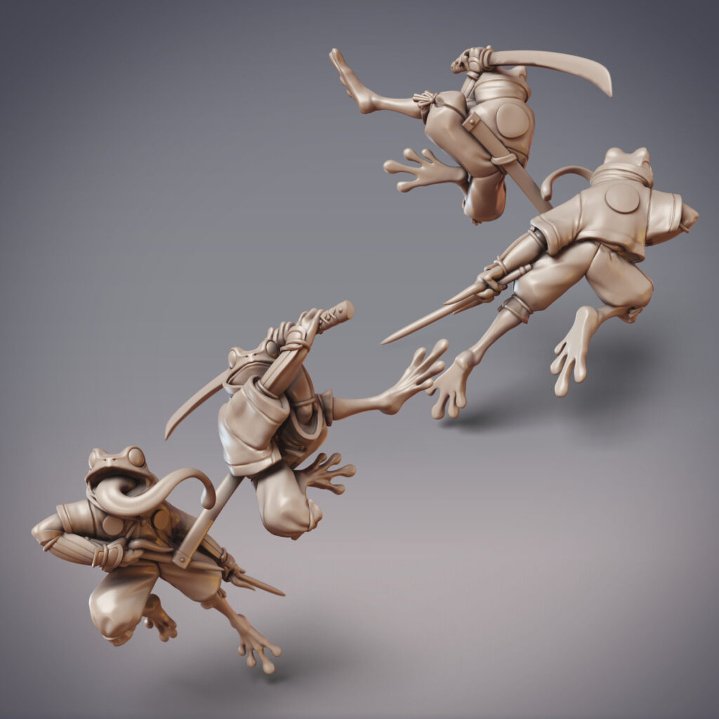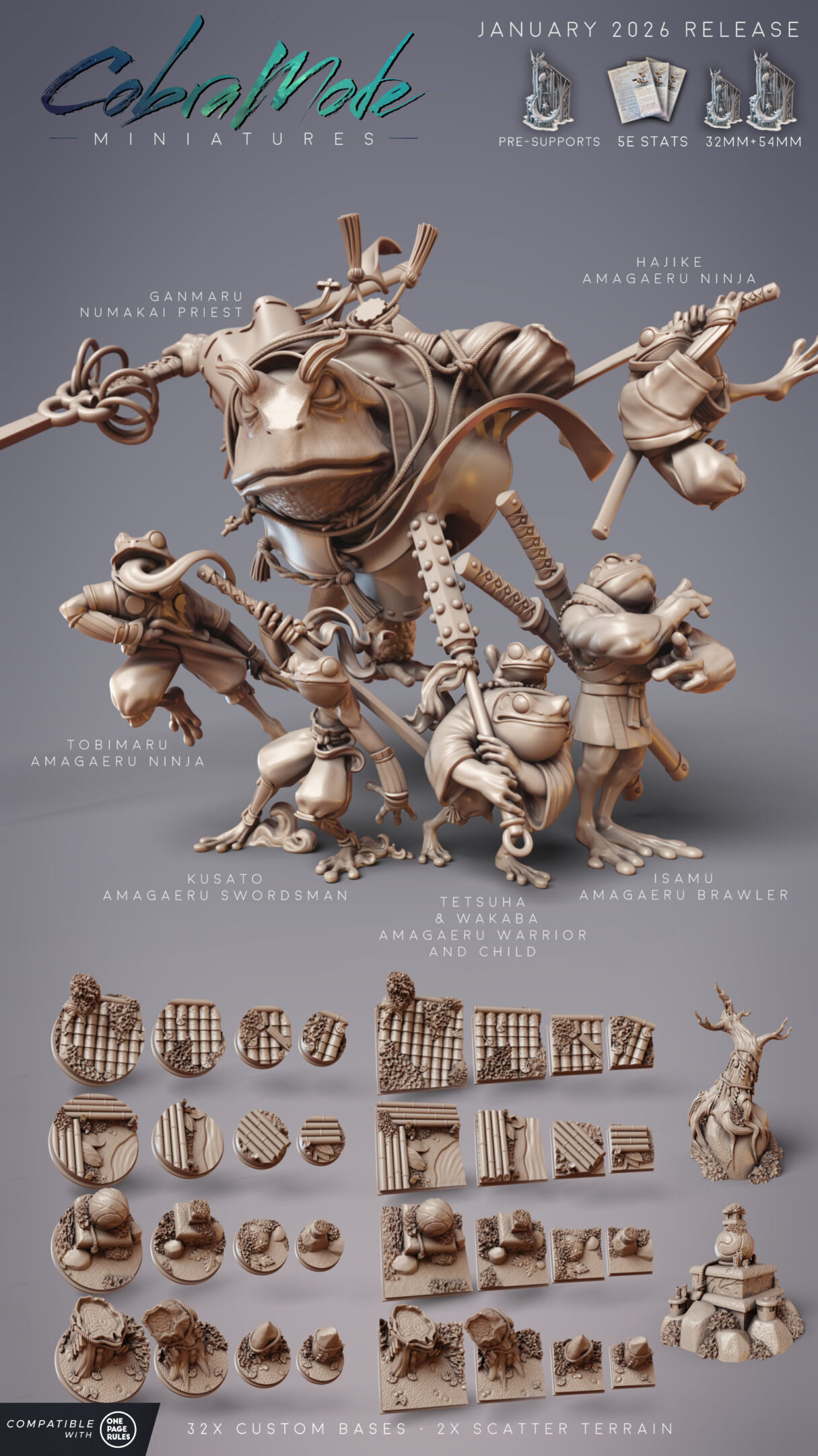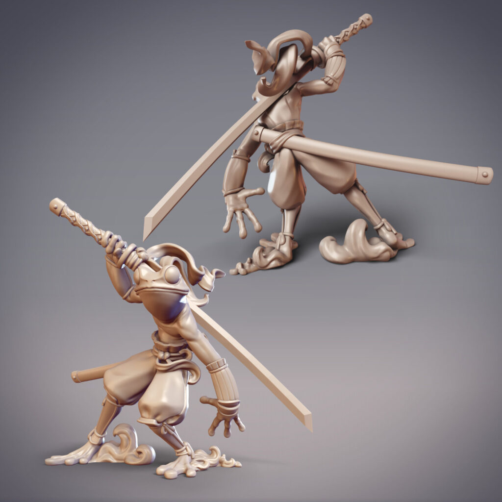 January is a froggy month, as we adventure alongside the Amagaeru and Numakai in the Uragakure Barrow Realm. This swampy realm is tied to a secret entrance somewhere in the Mikata Wetlands, which rogue Hanzaki have accessed in order to hatch an unsanctioned Ryujin to start their own clan. In comparison to the Hikiga toad folk who live in the Mikata, the Amagaeru are frogs with much more acquatic prowess, lithe and acrobatic in contrast with the stolid Hikiga. Much closer to them are the Numakai, also toad folk, but who much more closely resemble their animal brethren (including their large variance in size and appearance).