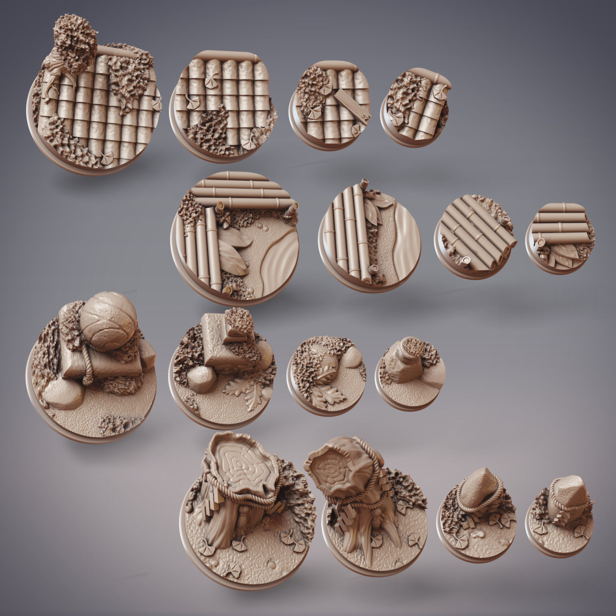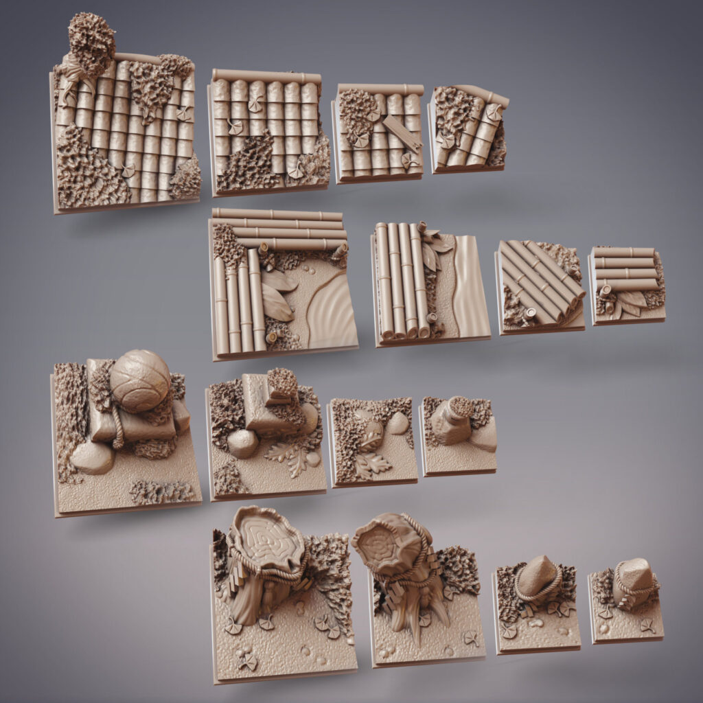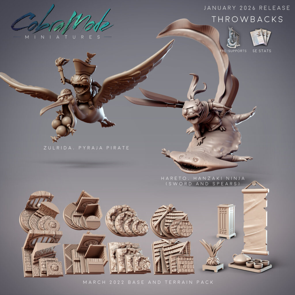 As usual, our wonderful themed base and terrain pack was sculpted by Calrais, with concept art by Paul Ferret. We have a perfect fit with our throwback base and terrain pack this month, along with Hareto, Hanzaki Ninja riding his diplocaulus mount, and Zulrida, Sommos Pyraja Pirate riding her pelican bomber!