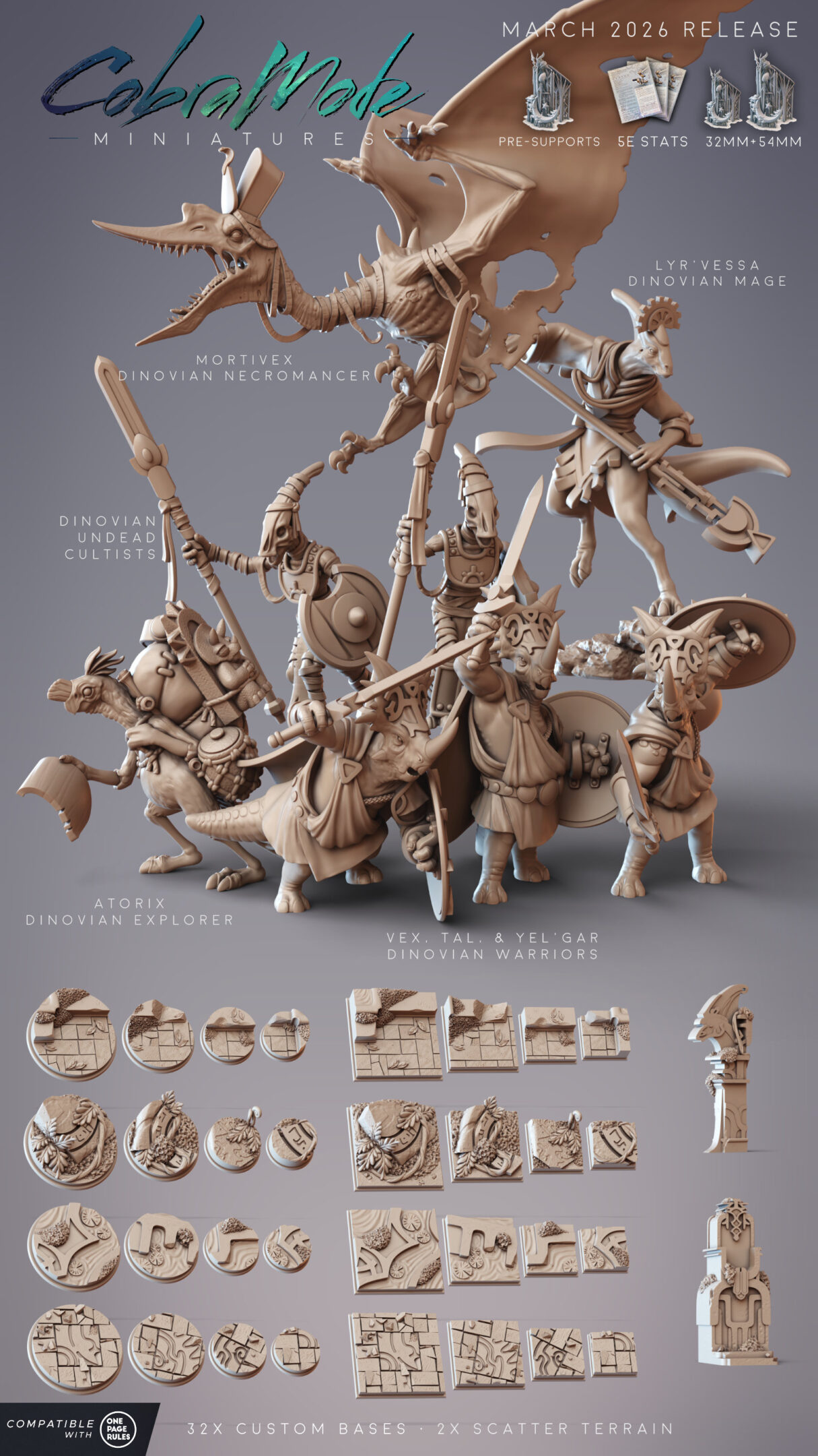 This month’s collection follows Atorix’s expedition into the Barrow Realms in search of exciting new artifacts and mysterious cultures. Unfortunately for him, they’ve run into a necromantic Realm ruled by Mortivex, a banished Dinovian death cult leader who has managed to tap into the power of the realm for his own nefarious ends! Will he and his coterie of warriors (and one pacifist mage) make it out alive?