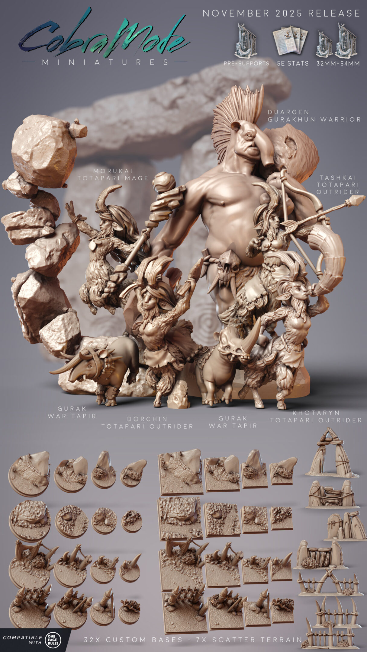 It’s been awhile since we visited the Kutugha Steppe, the arid grasslands and foothills where the Goksagu, Ariche, and Totapari roam. The Totapari goat-centaurs are allies of the Ariche reindeer folk, both sharing a nomadic lifestyle and a deep appreciation for nature and mother earth. Totapari are small and nimble, relying on their speed and numbers to overwhelm enemies while mages cast elemental spells. Outriders like Khotaryn, Dorchin, and Tashkai are essential for scouting, as wayfinders like Morukai, Totapari Mage, listen to the voices of the earth to determine their path. We’ve also introduced some tapir-based lifeforms, including the Gurak War Tapirs, and Duargen, Gurakhun Warrior. Some might question the battle-readiness of tapirs, but that would be a mistake…