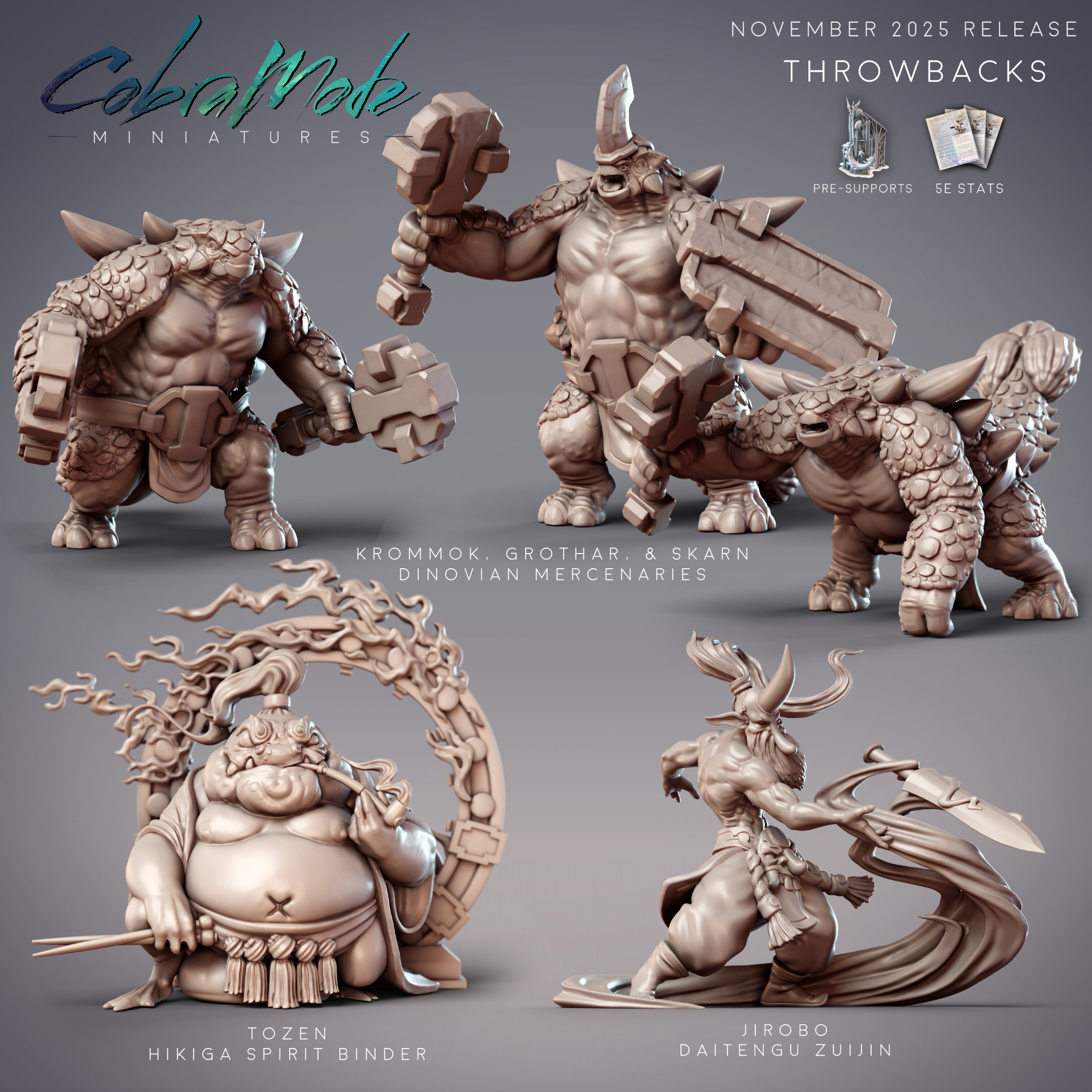 Our fantastic bases and terrain were sculpted by Calrais, with concept art by Paul Ferret. Paul also had some fantastic concepts for the characters this month, which I have added into the teaser posts (scroll through our previous posts to see them). The throwback poll was incredibly close, as there were so many great options to choose from. But we settled on this grouping, which has several of our fan favorites (Dinovians, Hikiga, and Daitengu).